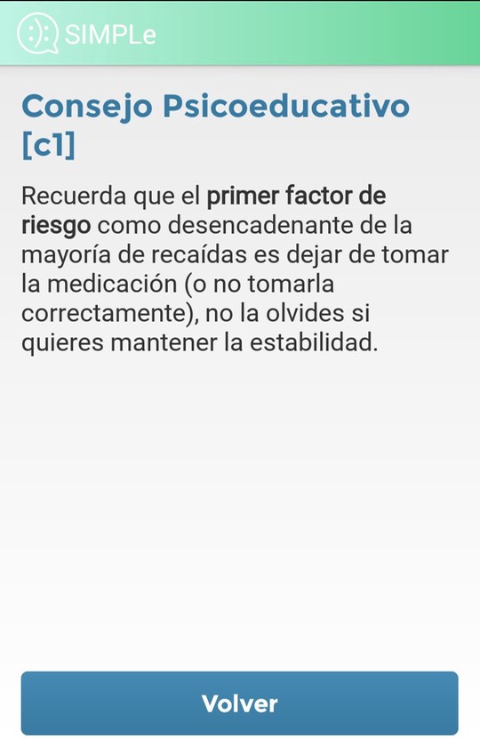 Los investigadores y autores de la aplicación no proveerán ningún tipo de consejo personalizado ni asesoramiento sobre el tratamiento psiquiátrico, psicológico o médico del usuario. Ante cualquier sintomatología, molestia o duda el paciente deberá consultar con su psiquiatra o psicólogo de referencia más allá de lo que la aplicación pueda aconsejar. Por tanto, los autores no se responsabilizan de ninguna consecuencia ni desenlace que tenga que ver o se derive del uso de esta aplicación. En caso de presentar sintomatología de reciente inicio o urgente, el paciente debería acudir a su centro sanitario más cercano para la evaluación y tratamiento que correspondan por un profesional de la salud mental.
